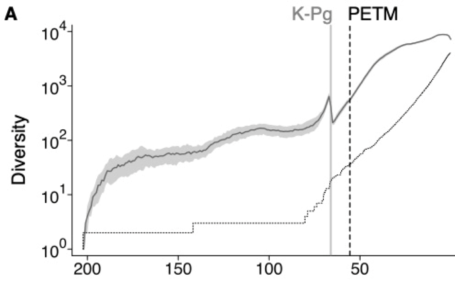 Hélène Morlon : La capacité de combiner les informations fossiles et phylogénétiques est un atout, en particulier pour l'extinction, puisqu'il est difficile de l'estimer à partir des seuls organismes actuels. Les mammifères en particulier ont un riche registre fossile, et ce n'est que lorsque nous les avons inclus que nous avons pu retrouver une extinction massive à la limite Crétacé-Paléogène (limite K-Pg), il y a environ 66 millions d’années, ainsi que d'autres phases d'extinction importantes spécifiques à certains sous-groupes.