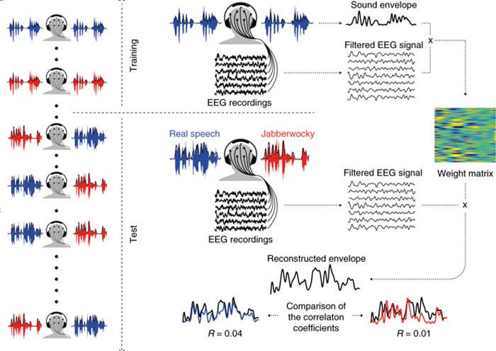 Dans cette étude, les chercheurs ont identifié, au cours de leur sommeil, les réponses cérébrales de plusieurs participants exposés simultanément à deux voix très similaires dans leurs propriétés acoustiques mais radicalement différentes en ce qui concerne leur sens : l’une prononçait des extraits de dialogues ou d’articles tandis que l’autre prononçait un flot de mots ressemblant au français mais dépourvu de sens. Les scientifiques ont alors utilisé une technique permettant de reconstruire ce que les dormeurs entendent à partir de leur activité cérébrale. Ainsi, ils ont pu confirmer que pendant le sommeil léger, les participants privilégient le message ayant du sens pour eux. De ce fait, même plongés dans le sommeil et inconscients, le cerveau enregistre les sons environnants, sépare les différentes sources auditives et sélectionne celle qui est la plus compréhensible.
