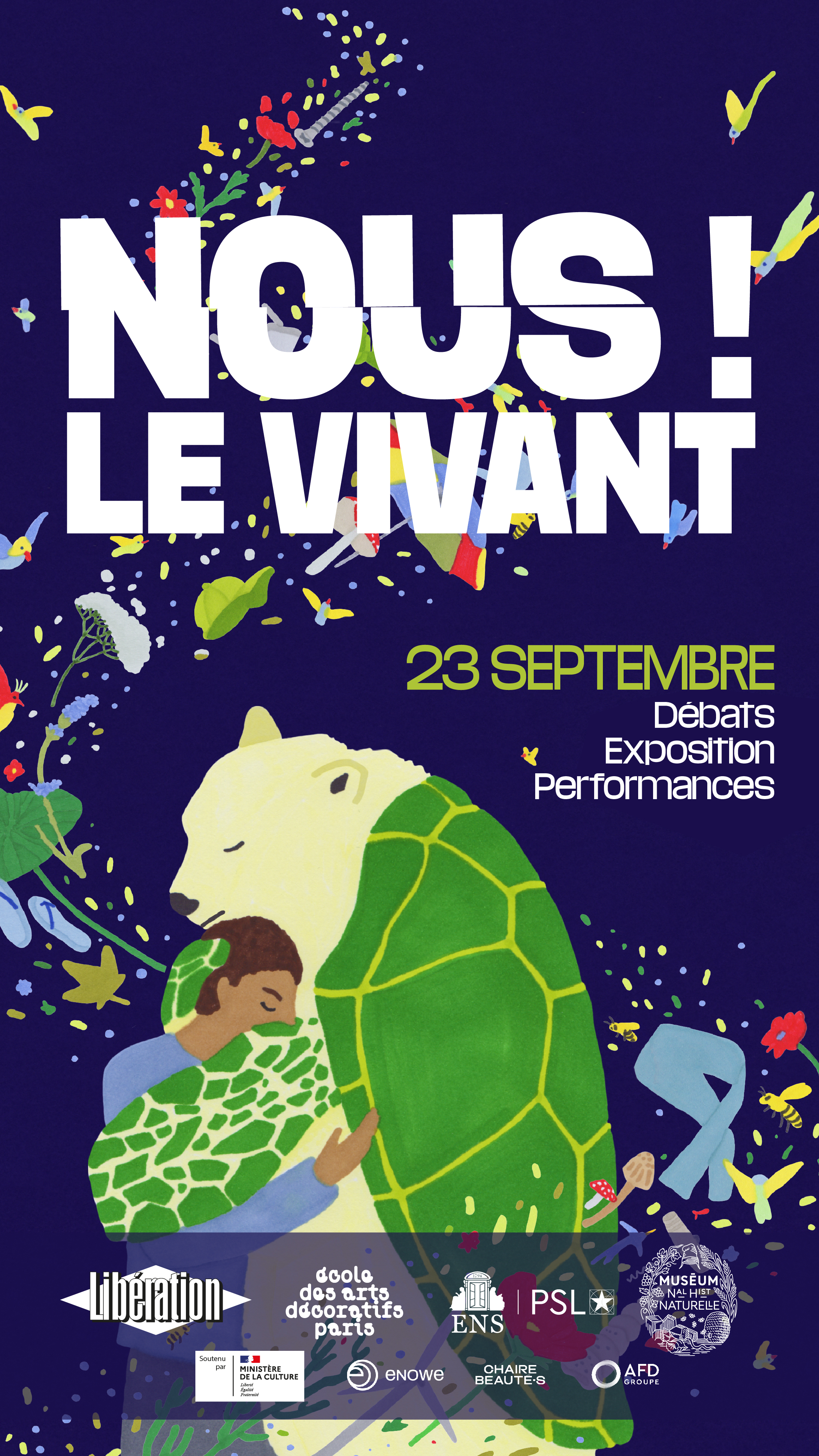 En 2023, trois des plus grandes institutions d’enseignement et de recherche françaises que sont l’École normale supérieure - PSL, le Muséum national d'Histoire naturelle et l’École des arts décoratifs s’associent à Libération et créent Nous ! Le vivant, une biennale exceptionnelle pour célébrer toutes les formes du vivant. Au programme : conférences, tables rondes, projections, échanges, lectures, spectacles dans les lieux mythiques de l’ENS-PSL et de l’École des Arts Décoratifs.